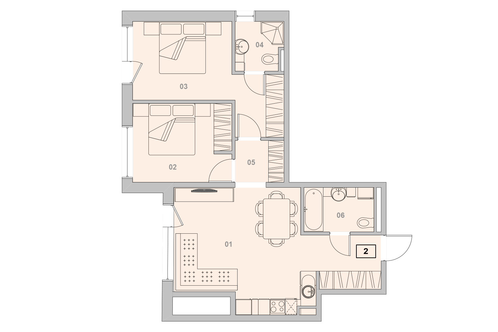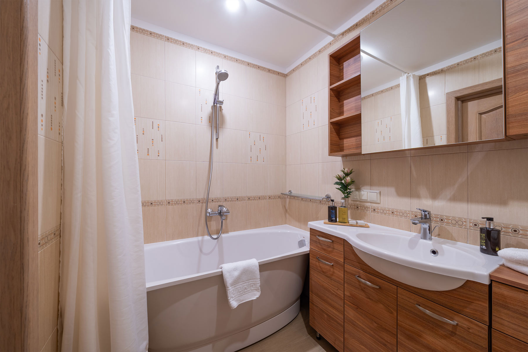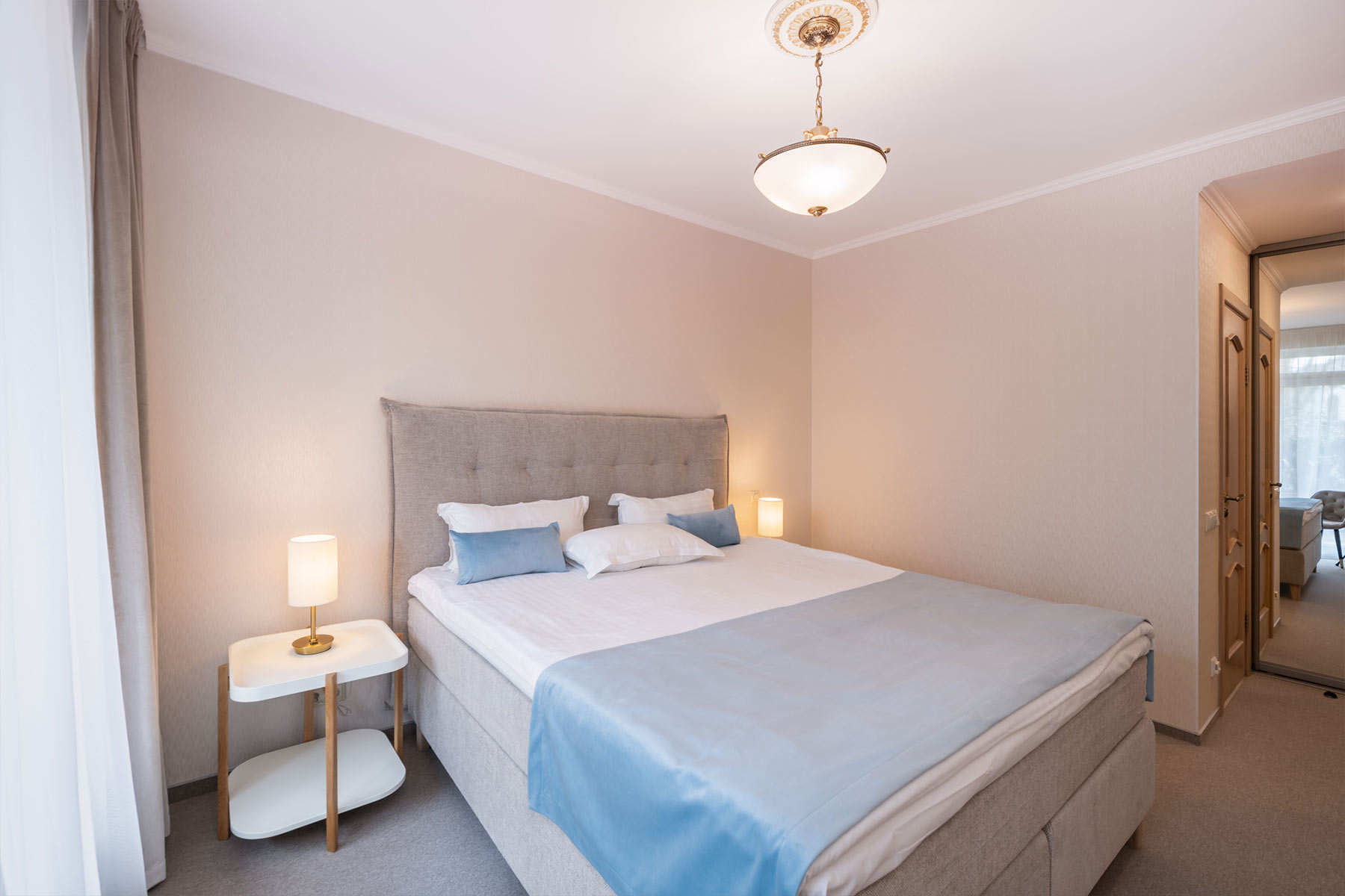 Šo apartamentu galvenā atšķirība — katrai guļamistabai ir sava vannas istaba (duša vai vanna).